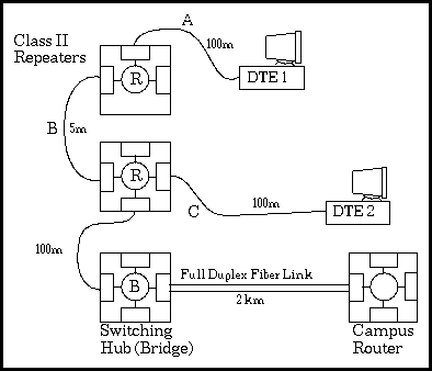 In other words, the inter-repeater segment (B) in Figure 14.3 could be 10 meters in length, as long as other segment lengths are adjusted to keep the maximum collision diameter to 205 meters. You should be wary of exploiting this, however, since designing a network that relies on shorter than standard links could cause confusion and problems later on. For example, if a new segment of 100 meters is attached to the system at some later time, the maximum diameter between some DTEs could then become 210 meters. If the path delay on this long path exceeds 512 bit times, then the network may experience problems such as late collisions and CRC errors.